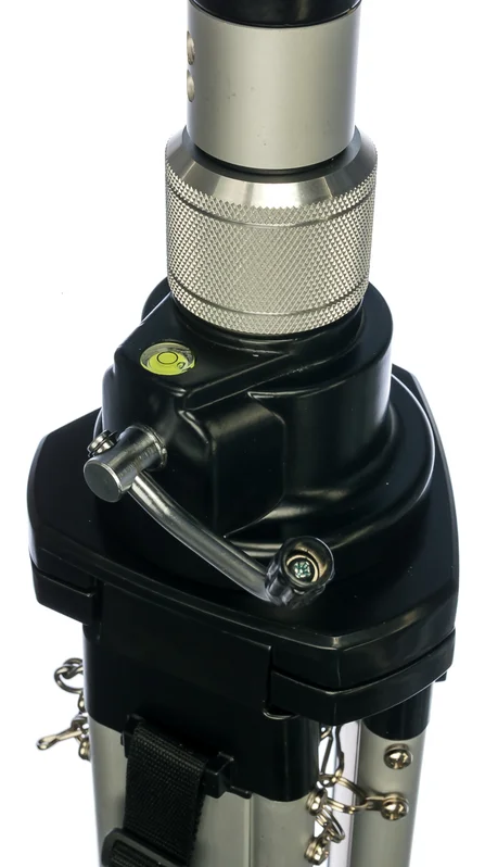Чтобы установить прибор на площадку штатива - нет необходимости "накручивать" его – достаточно просто поставить его на резьбу и повернуть специальный винт, встроенный в голову штатива. Он приведет в движение при помощи шестерни резьбу винта площадки. Штатив выполнен из алюминия и стали. Регулируемая колонка позволяет двигать вверх или вниз лазерный уровень для точного наведения или перемещения "базовой-горизонтальной лазерной плоскости"
