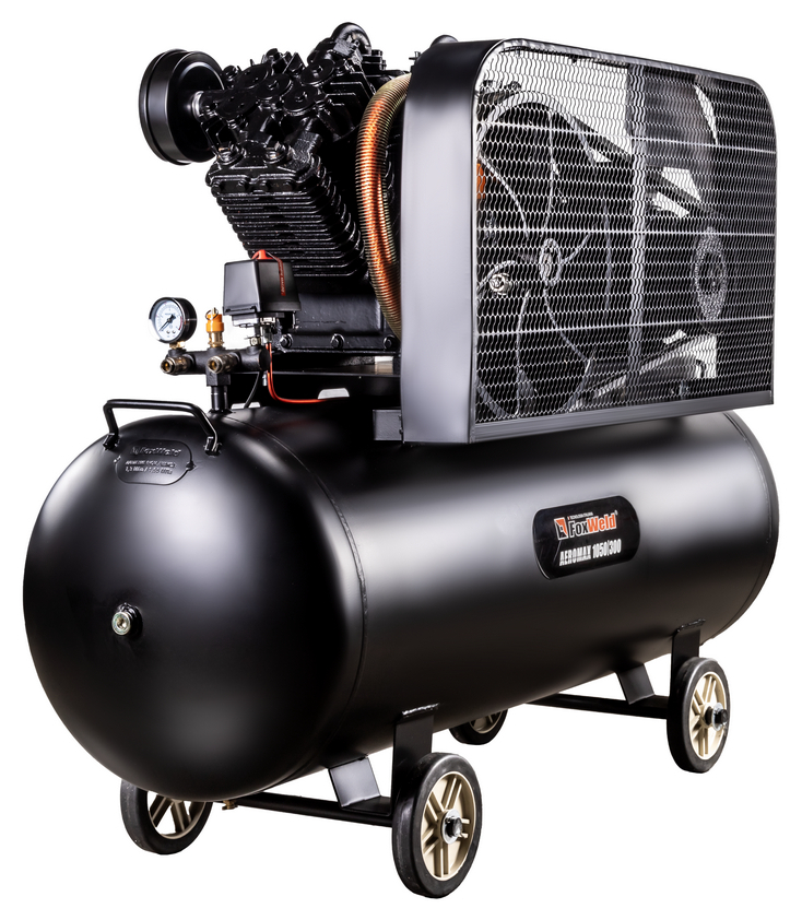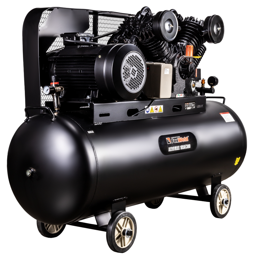 AEROMAX 1050/300 — воздушный четырёхпоршневой двухступенчатый масляный компрессор с ременным приводом имеет наибольшее давление 12,5 бар среди профессиональных компрессоров от Foxweld. Также данную модель отличает ресивер большого объема в 300 литров, и высокая производительность 1050 л/мин. Такие впечатляющие рабочие характеристики обеспечивает крупная четырёхпоршневая нагнетательная установка с двухступенчатой системой сжатия. AEROMAX 1050/300 подходит для выполнения всех видов профессиональных работ и длительной эксплуатации в условиях производственного цеха, автомобильной мастерской и строительной площадки. Трёхфазный асинхронный электродвигатель, комплексная система теплозащиты, удобный доступ для визуального контроля уровня масла гарантируют высокий срок службы оборудования и контроль своевременности технического обслуживания. Стандартно компрессор оснащен четырьмя выходами с быстросъёмными соединениями, одним регулятором давления с манометром, а также автоматическим реле с основным манометром для контроля уровня давления в системе. Дополнительно, ресивер компрессора может быть оснащен двумя выходами на которые, при необходимости, могут быть установлены шаровые краны 1/2" для максимальной подачи воздуха с минимальным внутренним сопротивлением. Ременная передача закрыта решеткой, предотвращающей ее повреждение, а также травмирование пользователя в случае обрыва ремня. Четыре колеса обеспечивают возможность перемещения устройства. Ресивер имеет качественное покрытие, препятствующее образованию коррозии.