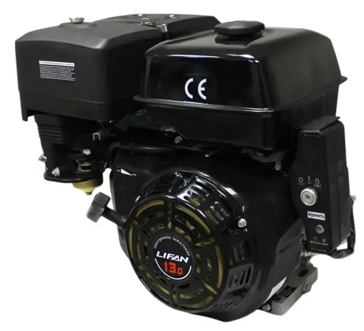 Бензиновый двигатель Lifan 188FD 13.0 л.с., эта модификация дополнительно оснащена электростартером. Одним из главных плюсов считается его малошумность и простота в использовании. Здесь предусмотрено много автоматики. Например, индикатор уровня масла. Если уровень масла дошел до критически-опасной отметки, то двигатель перестанет работать. Включится он только тогда, когда вы зальете в него новое масло. Модель профессиональная, гильза цилиндра выполнена из чугуна, что подтверждает ее износостойкость. Коленвал диаметром 25мм. Данная модель по своим показателям превосходит двигатели других производителей.