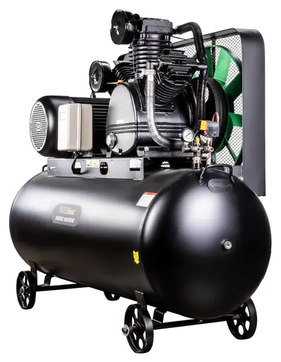 Например, компрессор может подключаться к ударному пневмоинструменту. Аппарат имеет высокопроизводительную компрессорную головку с поршнями увеличенного диаметра – 120 мм и комплексной системой теплозащиты включающую такие элементы как, спицы приводного шкива в виде лопастей, медные нагнетательные трубки с дополнительной обрешеткой, чугунные стенки и крышки цилиндров с крупными ребрами охлаждения. Также надежность и высокий ресурс коленвала обеспечивает увеличенный объем масляного картера. Данная модель оснащена 4 быстросъемными выходами. Для подключения чувствительного к влаге и маслу инструмента, например, краскопультов, для двух быстросъемных выходов в компрессоре предусмотрено наличие интегрированного фильтра-осушителя с регулировкой давления. Также на корпусе ресивера имеется два выхода в которые при необходимости может быть установлен шаровый кран 1/2" для максимальной подачи воздуха с минимальным внутренним сопротивлением. Безопасность работы обеспечивает автоматическое реле давления с манометром и аварийный (перепускной) клапан сброса давления. Ременная передача и шкивы закрыты решеткой, предотвращающей ее повреждение, а также травмирование пользователя в случае обрыва ремня. Четыре колеса обеспечивают возможность перемещения устройства. Ресивер имеет сливной кран для конденсата и качественное покрытие, препятствующее образованию коррозии.
