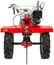 Двигатель этого агрегата имеет мощность 15 лошадиных сил, произведён по спецификации знаменитого завода LIFAN. Топливный бак объёмом 6.5 литров и экономичный расход топлива, дают возможность долгое время работать без дозаправки. Высококачественная коробка передач имеет 2 скорости вперёд и 1 назад. Аппарат оснащён мощным, цельнолитым чугунным редуктором, созданным специально для эксплуатации в жёстких условиях на тяжёлых грунтах и для обработки целины. Зубчатая передача, которая сообщает крутящий момент двигателя колёсам и фрезам, отличается надёжностью и долговечностью. Сцепка мотоблока изготовлена с большим запасом прочности и позволяет работать не только с сошником, плугом или окучником, но и с телегой.