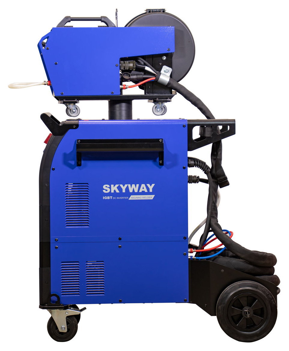 SKYWAY 500 – 3-х фазный инвертор для полуавтоматической сварки в среде инертного/активного защитного газа MIG-MAG и ручной дуговой сварки штучным электродом MMA, - как с источника так и с выносного подающего механизма. Тележка с подставкой под баллон, высокая компоновка аппарата, встроенная станция охлаждения, подающий механизм "декомпакт" в базовом комплекте поставки - все эти моменты существенно облегчают работу сварщика и значительно увеличивают время непрерывной работы аппарата. SKYWAY – это передовая технология инверторного блока IGBT, отличные сварочные характеристики и превосходная эргономика управления.