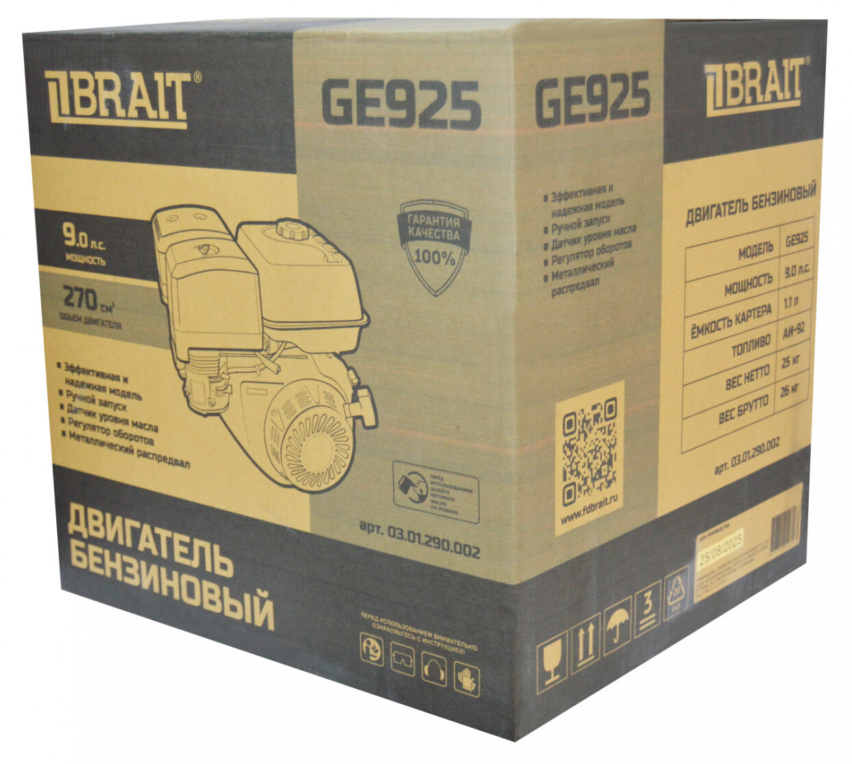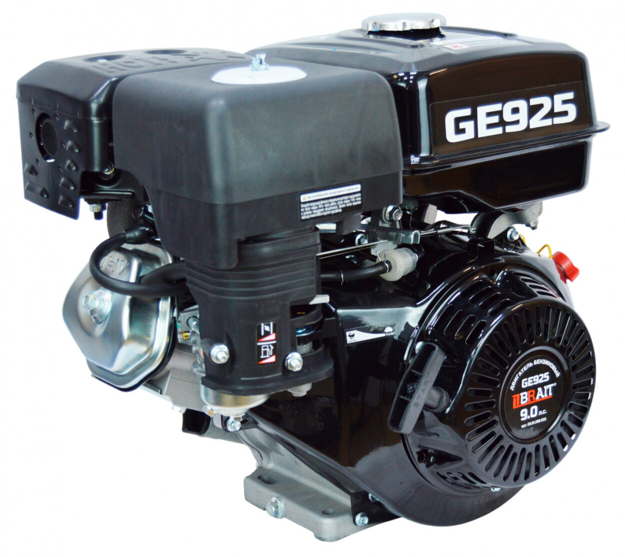 Двигатель бензиновый BRAIT GE925 четырехтактный одноцилиндровый силовой агрегат с воздушным охлаждением работает на бензине АИ-92.