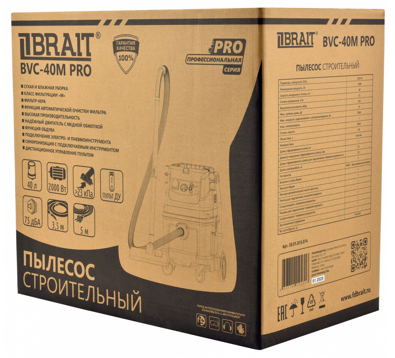 Характеристики Пылесос строительный BRAIT BVC-40M PRO (2 кВт)