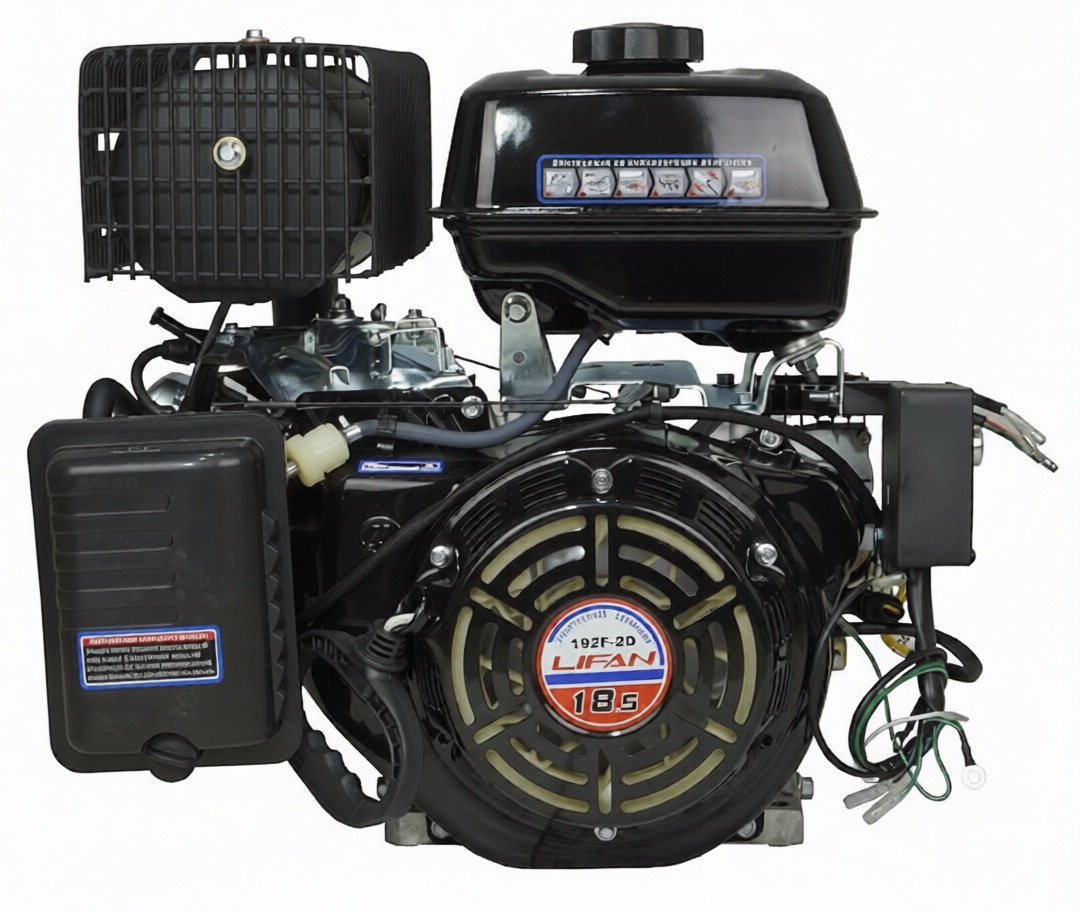 Бензиновый двигатель Lifan 192F-2 3А мощностью 18,5 л.с. устанавливается на различную малую технику бытового применения. Ручной стартер – это гарантия надежного запуска в любых погодных условиях. Усиленная конструкция корпуса двигателя за счет ребер жесткости является безопасной в эксплуатации и транспортировке. Наличие топливного крана, ограждающего карбюратор от попадания в него топлива, важно при установке. Размеры двигателя сопоставимы с предыдущей по мощности моделью 192F на 17л.с., увеличение мощности достигнуто за счет большего хода поршня, здесь он 69мм.