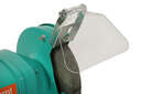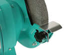 Защитные кожухи закрывающие точильные круги для большей безопасности выполнены из прочной стали, стойкой к поверхностному воздействию отлетающей при заточке стальной стружки и абразивной пыли. Съемные крышки кожуха обеспечивают быструю замену точильных кругов, а также о настройку и обслуживание станка. Дополнительное удобство и безопасность проведения технологических операций придают стальные подручники с изменяемой дистанцией, которые позволяют надежнее вести заготовку и тем самым обеспечивают высокое качество ее заточки. Кроме того, станина имеет четыре резиновые демпферные подушки для большей устойчивости и снижения рабочих шумов и вибраций. Защитное стекло имеет трапециевидную форму и прозрачные кромки для того, чтобы обеспечить наилучший обзор обрабатываемого участка и получить качественный результат работ. Прозрачный полимерный экран легко поворачивается на нужный угол, защищая оператора от вылета мелких частиц из-под вращающегося точильного круга, и помогая ему безопасно контролировать рабочий процесс. Прочный силиконовым колпачок герметично закрывает пусковую клавишу от попадания воды и наждачной пыли, обеспечивая надежную работу сетевого выключателя. Полимерный эластичный кабель обеспечивает надежное питание в любых условиях использования инструмента