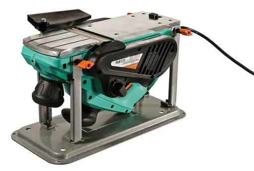 - Возможность установки в стационарной положение на металлической станине, которая входит в комплект, что превращает рубанок в строгальный мини станок