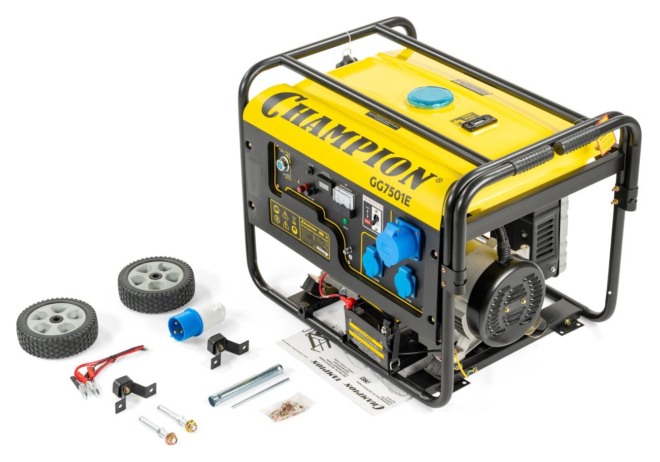 Бензиновый генератор Champion GG7501E, оснащенный электростартером, подойдет для питания бытовых приборов и инструментов.
