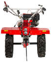 Двигатель этого агрегата имеет мощность 9 лошадиных сил, произведён по спецификации знаменитого завода LIFAN. Топливный бак объёмом 6 литров и экономичный расход топлива, дают возможность долгое время работать без дозаправки. Высококачественная коробка передач имеет 2 скорости вперёд и 1 назад. Аппарат оснащён мощным, цельнолитым чугунным редуктором, созданным специально для эксплуатации в жёстких условиях на тяжёлых грунтах и для обработки целины. Зубчатая передача, которая сообщает крутящий момент двигателя колёсам и фрезам, отличается надёжностью и долговечностью. Сцепка мотоблока изготовлена с большим запасом прочности и позволяет работать не только с сошником, плугом или окучником, но и с телегой.
