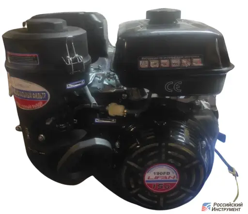Двигатель Lifan 190FD - это 4-х тактный одноцилиндровый бензиновый двигатель с воздушным охлаждением и горизонталным расположением вала отбора мощности. Двигатели Лифан 190FD серии Horizontal до 15 кВт отличаются следующими конструктивными особенностями: топливный кран позволяющий перекрывать подачу топлива в карбюратор при транспортировке; чугунная гильза цилиндра, увеличивающая моторесурс двигателя.