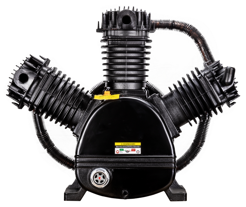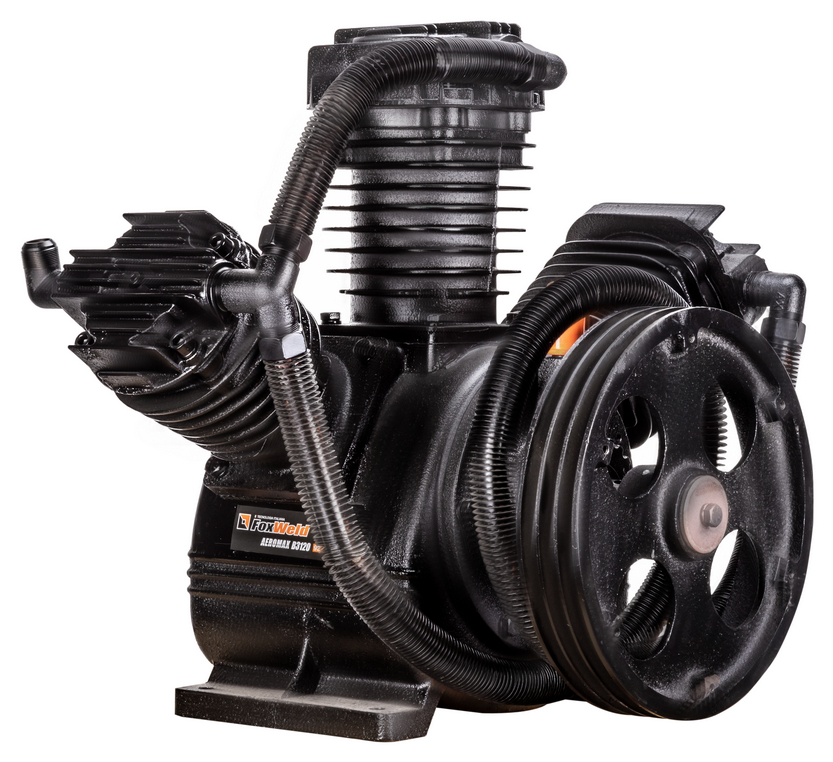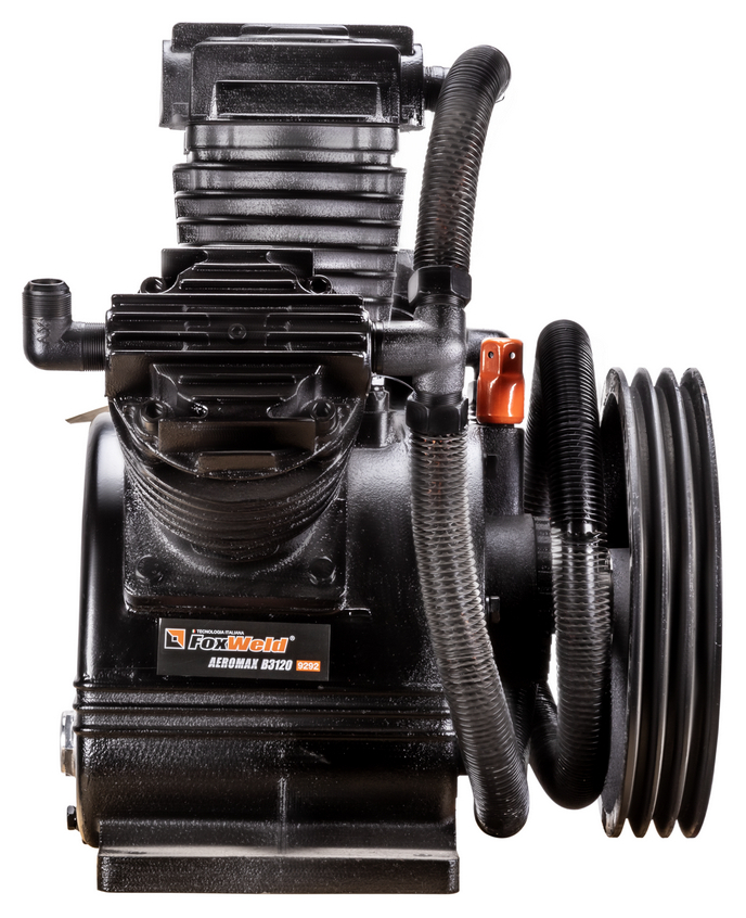 Компрессорная головка ременная AEROMAX B3120 – это сменная помпа (нагнетательная часть) для поршневых ременных масляных воздушных компрессоров. В конструкции головки три поршня диаметром 100 мм. Мощность подключаемого электродвигателя должна быть не менее 15 кВт. При данной мощности производительность на входе может достигать 1650 л/мин при рабочем давлении до 12,5 бар. Рёбра охлаждения (рубашки) на цилиндрах и лопасти на ведомом шкиве обеспечивают эффективное охлаждение. Ведомый двухручейковый предустановлен и идёт в комплекте. Для смазки цилиндропоршневой группы предусмотрен встроенный масляный картер для компрессорного масла VDL 100. Подключение к компрессору механическое - через ременную передачу. Воздушная магистраль от ресивера компрессора подключается к выпуску компрессорной головки. Электромотор компрессора через ременную передачу вращает шкив компрессорной головки, приводя в движение поршни внутри цилиндров, которые соответственно тактам производят забор воздуха из окружающей среды через впускное отверстие и под давлением закачивают его в ресивер компрессора по воздушной магистрали. На впуск необходимо установить воздушные фильтры с посадочной резьбой M33 х 1,5 (приобретаются отдельно).