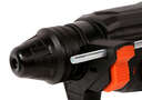 В интересах надежного и быстрого крепления оснастки, модель оснащена быстрозажимным патроном SDS+. Безопасному ходу эксплуатации способствует встроенная предохранительная муфта, активная при заедании или защемлении оснастки, что предотвращает внезапный резкий поворот инструмента в руках оператора. Для удобства в обращении, оснастка и дополнительная рукоять, регулируется в нужное положение.