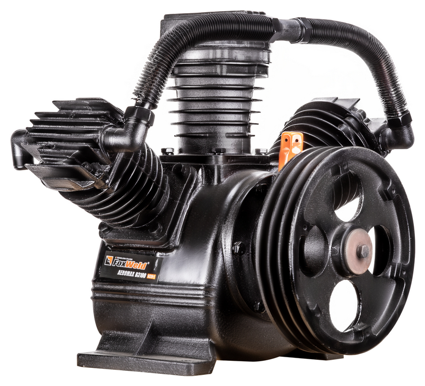 Компрессорная головка ременная AEROMAX B3100 – это сменная помпа (нагнетательная часть) для поршневых ременных масляных воздушных компрессоров. В конструкции головки три поршня диаметром 90 мм. Мощность подключаемого электродвигателя должна быть не менее 11 кВт. При данной мощности производительность на входе может достигать 1350 л/мин при рабочем давлении до 12,5 бар. Рёбра охлаждения (рубашки) на цилиндрах и лопасти на ведомом шкиве обеспечивают эффективное охлаждение. Ведомый двухручейковый предустановлен и идёт в комплекте. Для смазки цилиндропоршневой группы предусмотрен встроенный масляный картер для компрессорного масла VDL 100. Подключение к компрессору механическое - через ременную передачу. Воздушная магистраль от ресивера компрессора подключается к выпуску компрессорной головки. Электромотор компрессора через ременную передачу вращает шкив компрессорной головки, приводя в движение поршни внутри цилиндров, которые соответственно тактам производят забор воздуха из окружающей среды через впускное отверстие и под давлением закачивают его в ресивер компрессора по воздушной магистрали. На впуск необходимо установить воздушные фильтры с посадочной резьбой M33 х 1,5 (приобретаются отдельно).